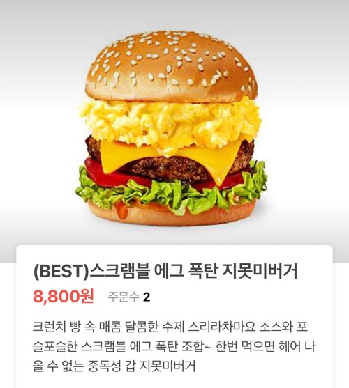계란이 들어간 햄버거는 체인점에 잘 없잖아요? 근데 두툼하게 계란이 들어가 있어서 다음에 꼭 먹어보고싶어요~