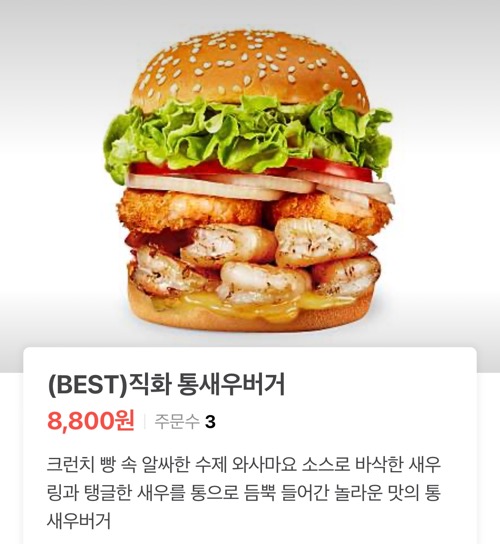 직화 통새우버거는 통새우와 새우링튀김이 들어간 햄버거입니다.